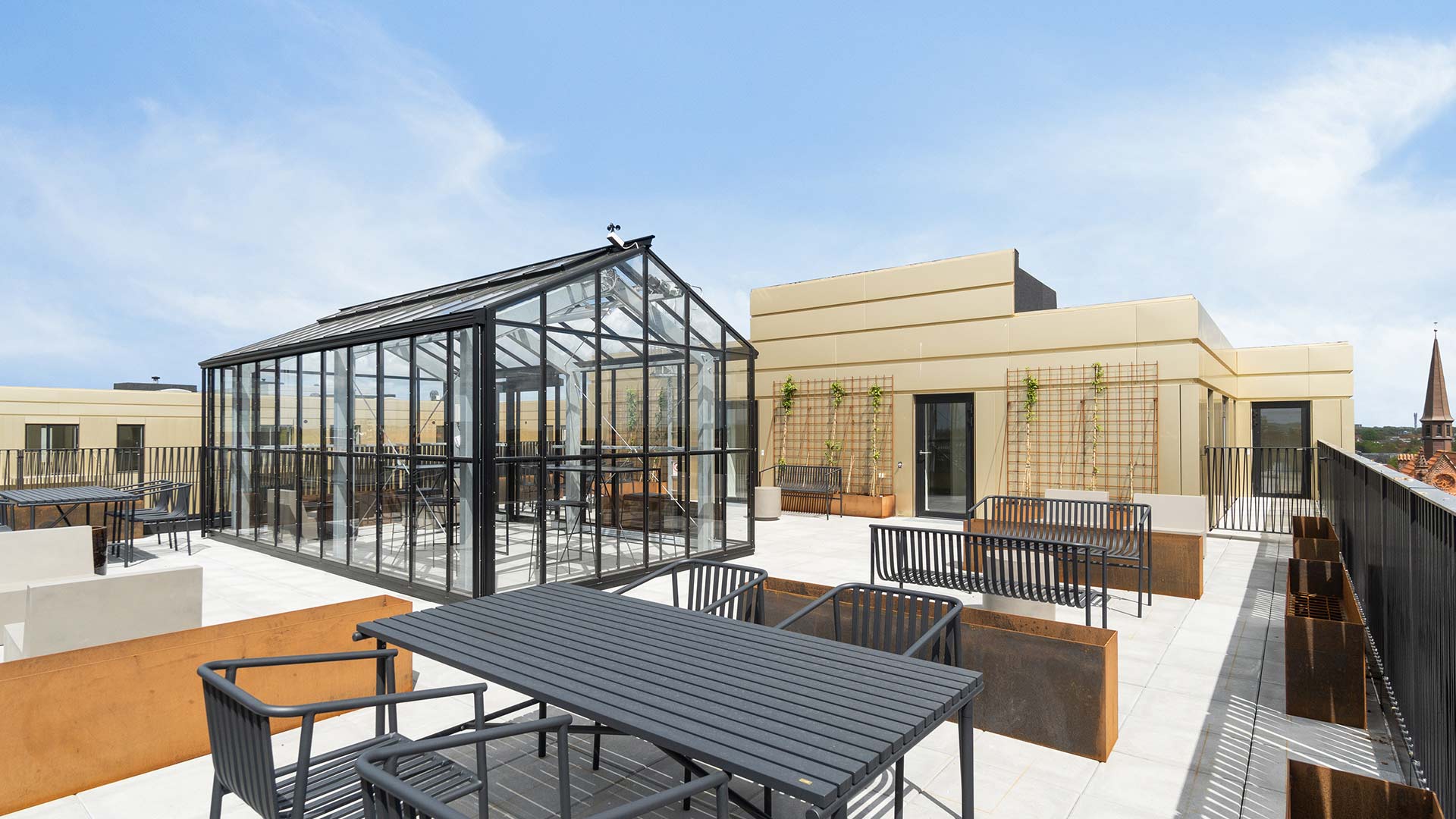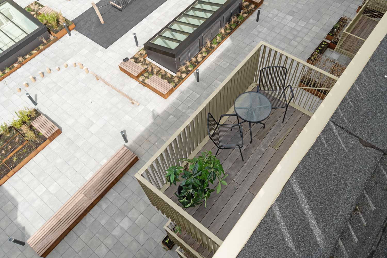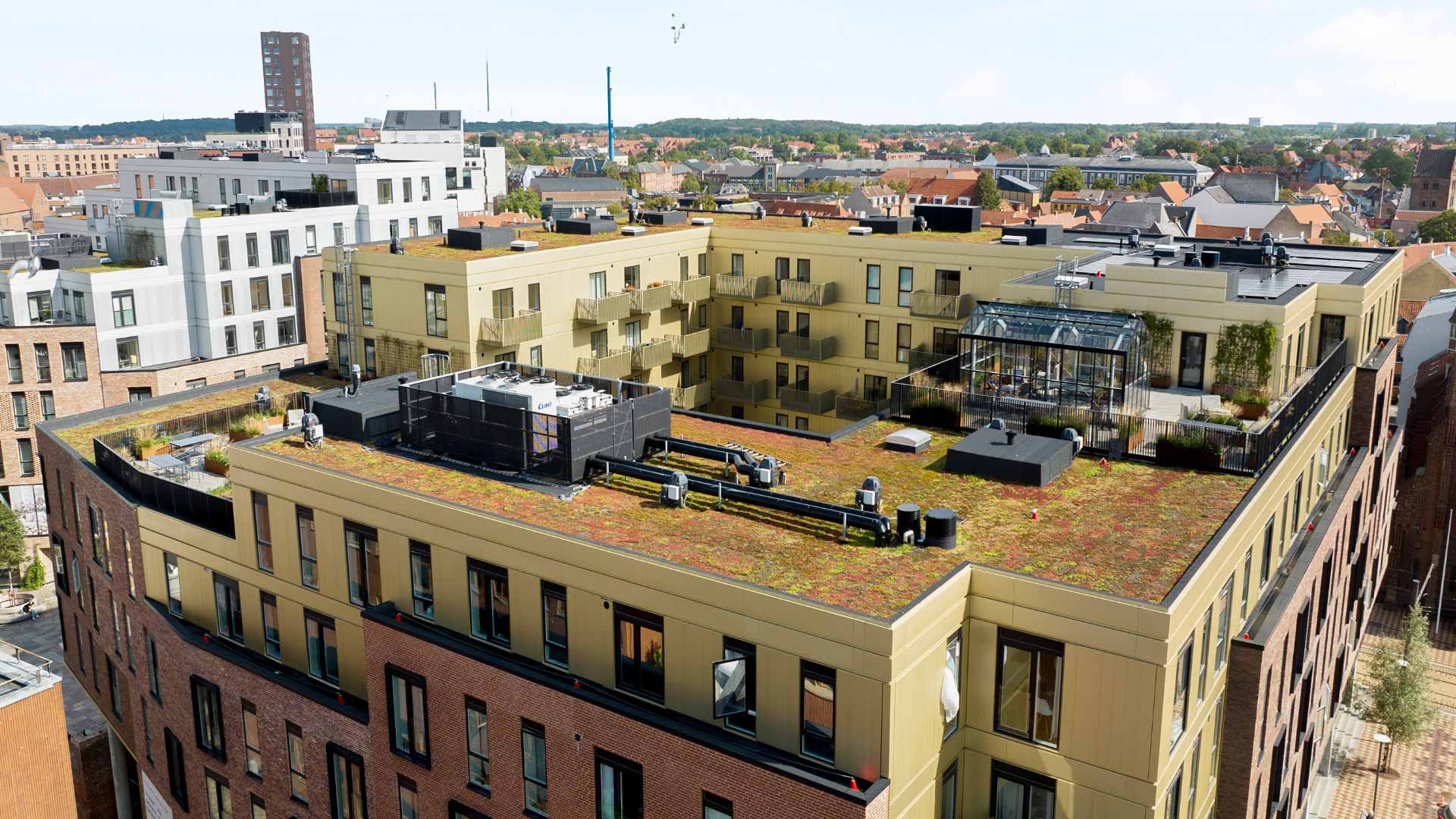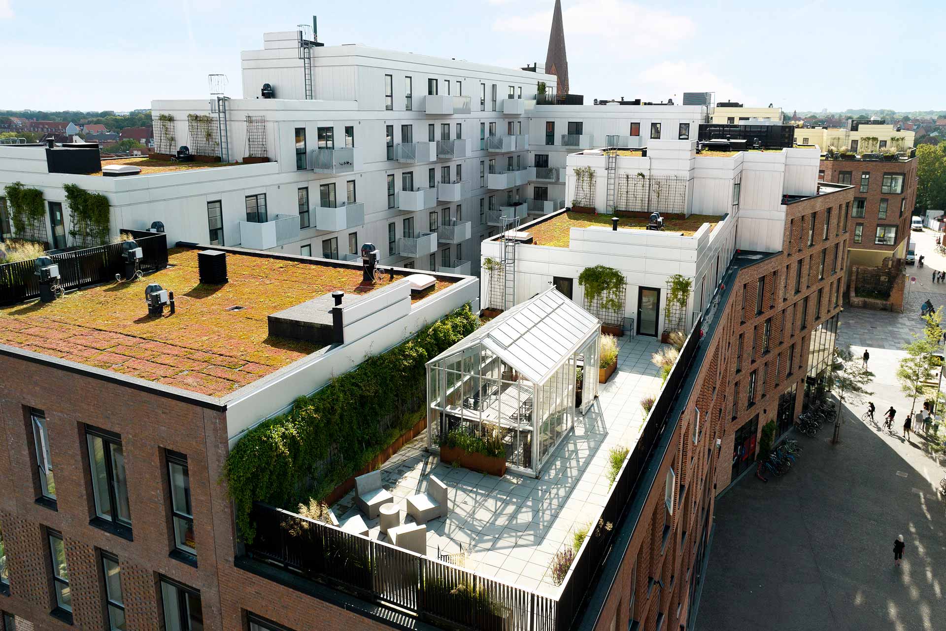Karréerne er opført i varierende højder, der muliggør grønne tagterrasser og store, rekreative fællesområder. På denne måde bliver de imponerende ejendomme brudt op af små opholdszoner, plantebede og smuk, grøn beplantning, samtidig med at de mange store fællesområder indbyder til små pauser og socialt samvær i solen.