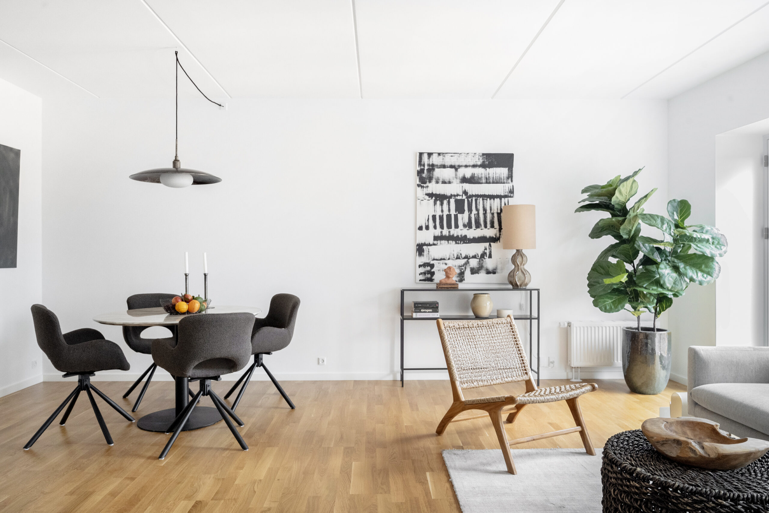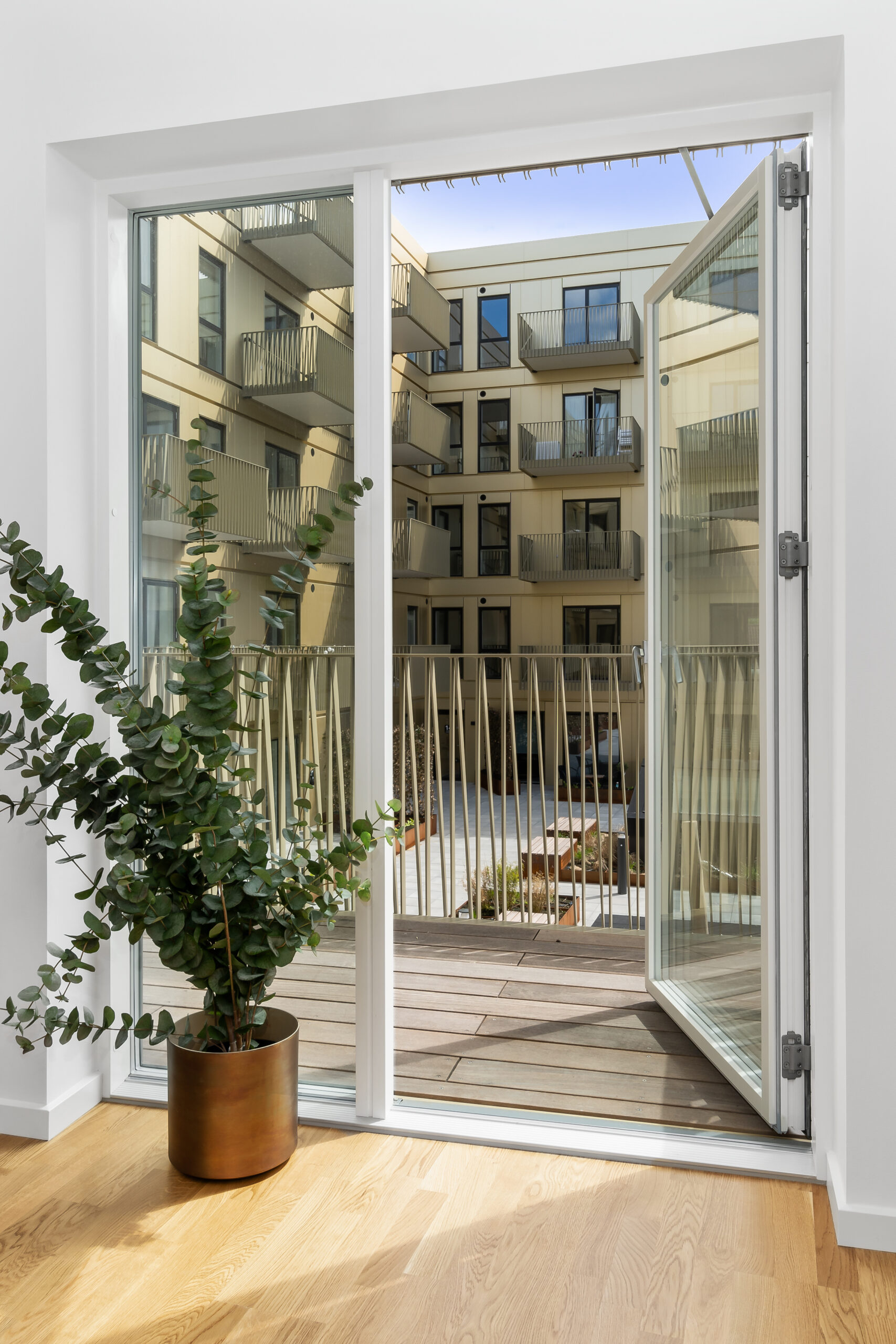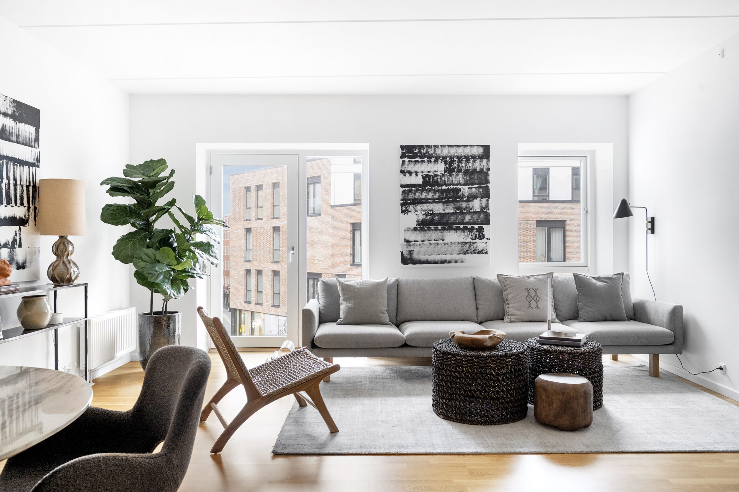 Indvendigt er der valgt lyse kvalitetsmaterialer, der giver en let og luftig stemning, og sætter rammerne om et moderne og indbydende hjem midt i byen.