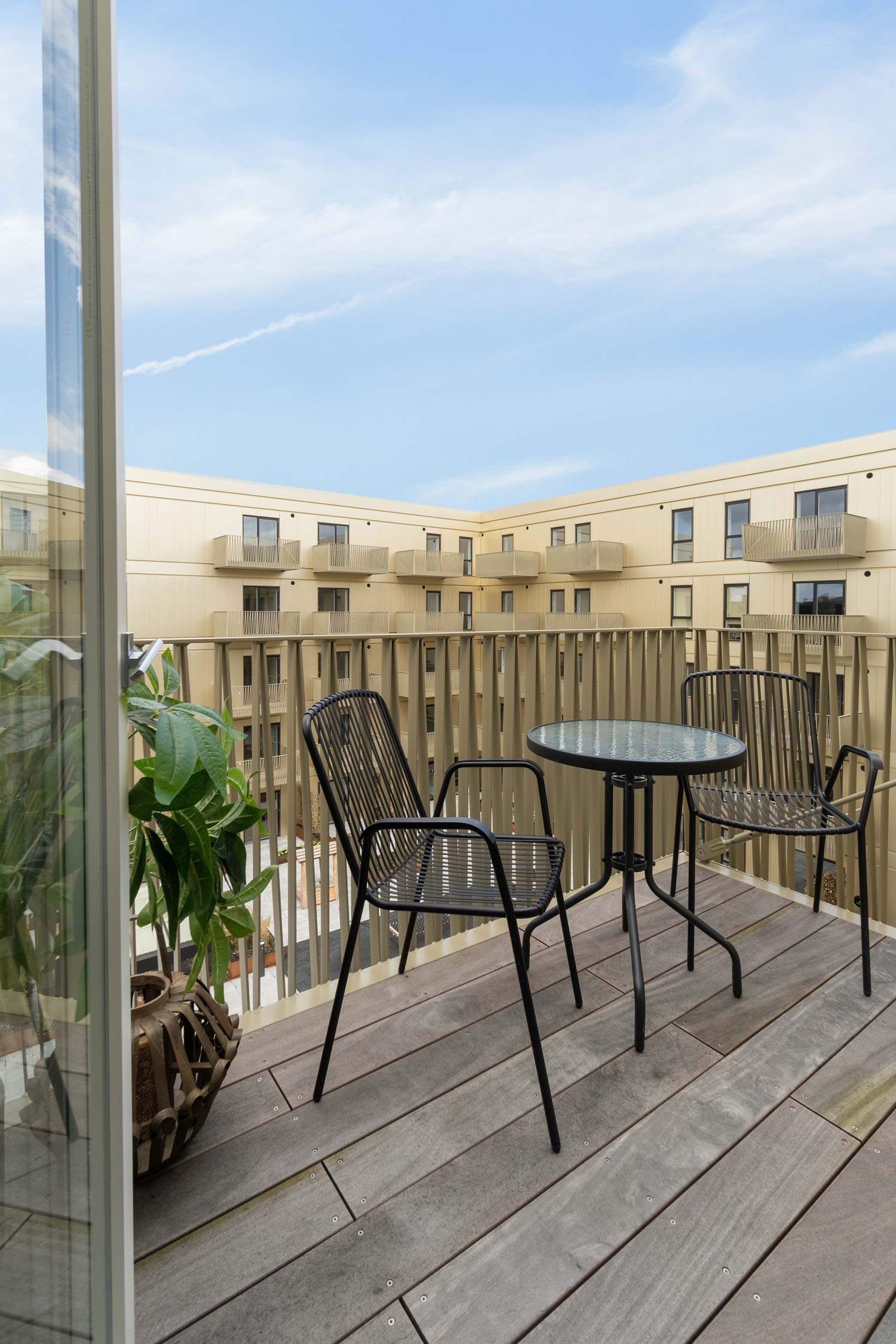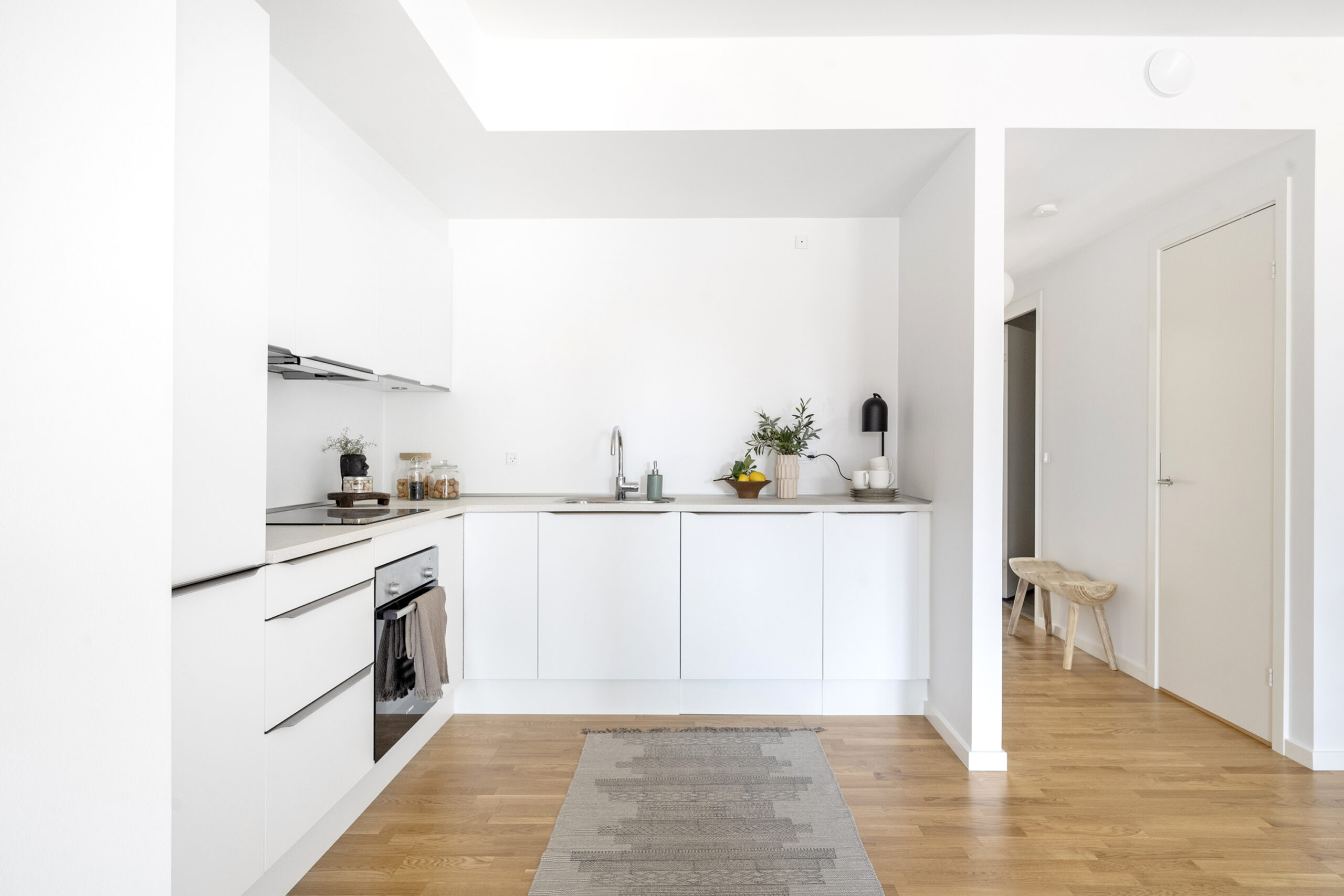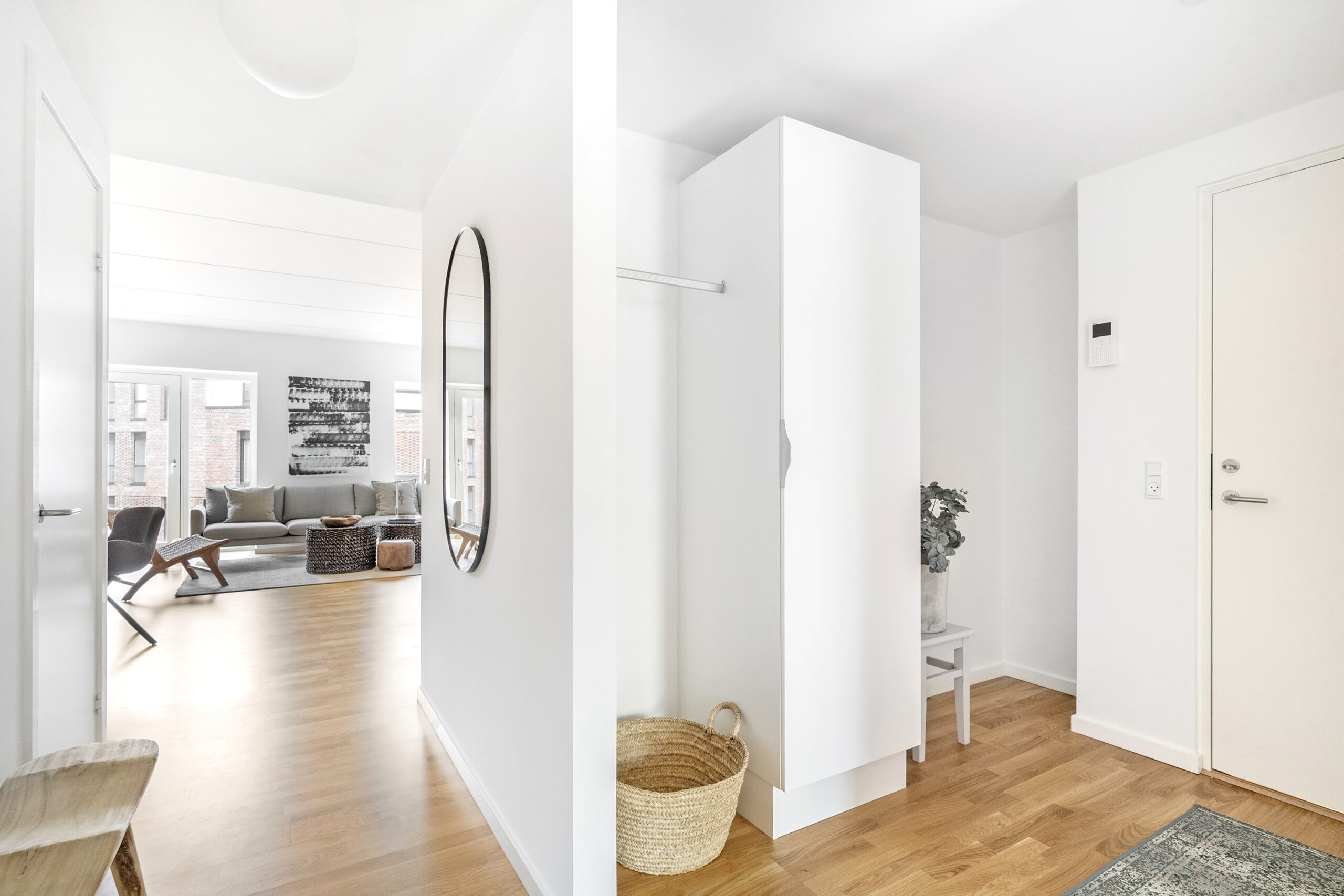 Indvendigt er der valgt lyse kvalitetsmaterialer, der giver en let og luftig stemning, og sætter rammerne om et moderne og indbydende hjem midt i byen.
